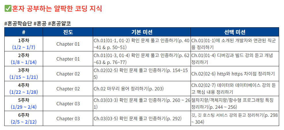 - 혼공 시리즈 11권 중에 한 권을 선택하여 6주간 공부합니다.