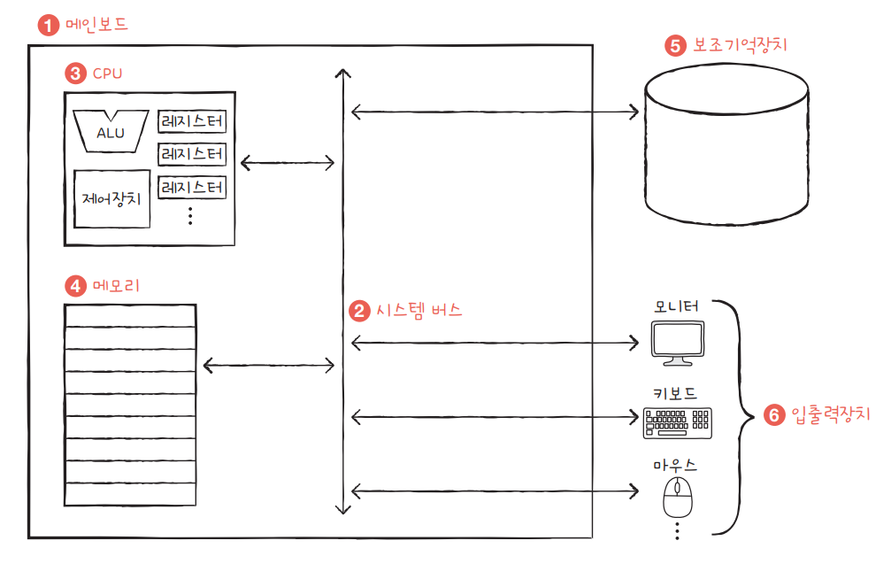 - 컴퓨터의 네 가지 핵심 부품 : 중앙처리장치(CPU), 주기억장치(메모리), 보조기억장치, 입출력장치